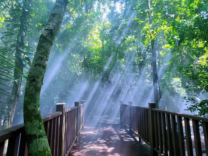 走进七仙岭,“野蛮”生长的热带植物强势占据了每一个游人的眼;绿林中畅快撒欢的绿蛙、鸟雀等小精灵为这片沉沉的绿林增添了一丝丝活泼,这是独属于雨林的深沉热情。山林不动,安静又活泼地欢迎着每一个游人。