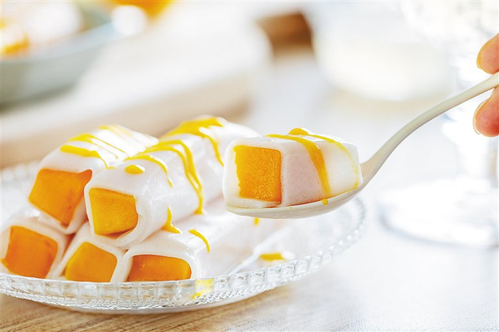 这道甜品的独特在于巧用椰浆、澄粉与牛奶混合,煮干后结皮,匠心独具地制成了柔软嫩滑如凝脂般的雪白肠粉。芒果和带有椰浆的肠粉之间实现融合,口感似啫喱,让酸甜可口的美味沁人心脾、爽滑柔软的触感更加真切。