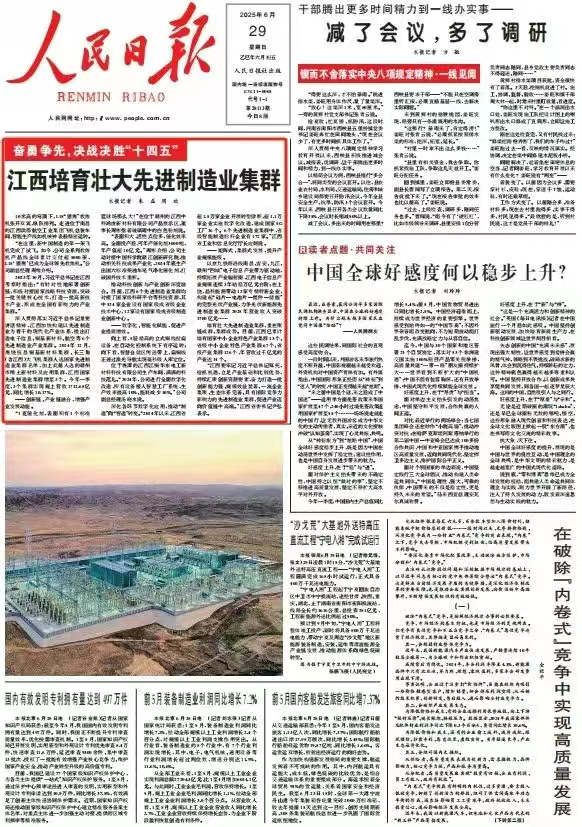 6月29日,《人民日报》头版头条刊发通讯——《江西培育壮大先进制造业集群》,从创新链、产业链融合,数字化、智能化赋能,矩阵式、集群式发展三个维度,对我省加快构建以先进制造业为骨干的现代化产业体系的成效和亮点进行深入剖析和解读。