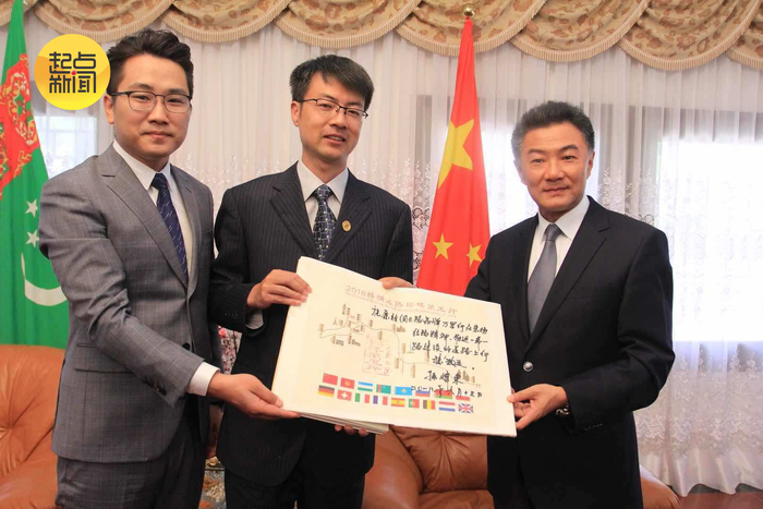 2018年,时任中国驻土库曼斯坦大使孙炜东与“丝绸之路万里行”活动成员合影