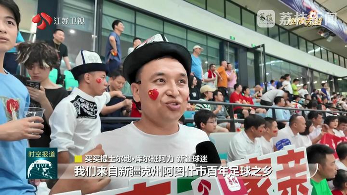 新疆球迷买买提土尔地·库尔班阿力说:“我们来自新疆克州阿图什百年足球之乡。因为江苏援疆克州,我们为兄弟城市加油而来。”