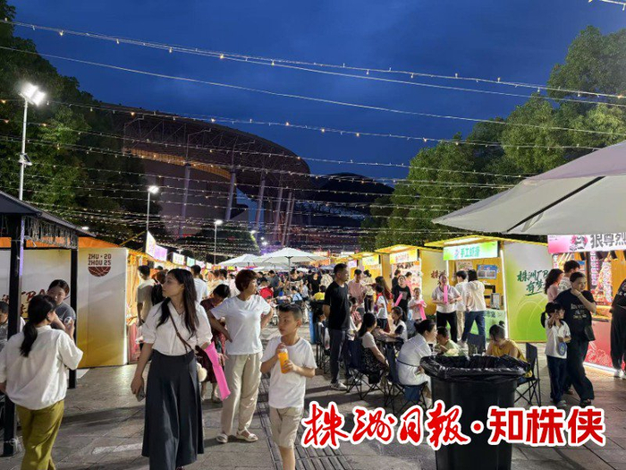 更多的“混搭”场景随处可见,株洲特色的“院子餐饮”开辟休闲区,成为市民游客小憩聊天的好去处;小学生们带着学校社团的手工作品前来义卖或展览,童趣盎然;多家医疗机构则摆开“养生夜市”,提供茶饮、艾灸、按摩等健康服务,烟火气十足。