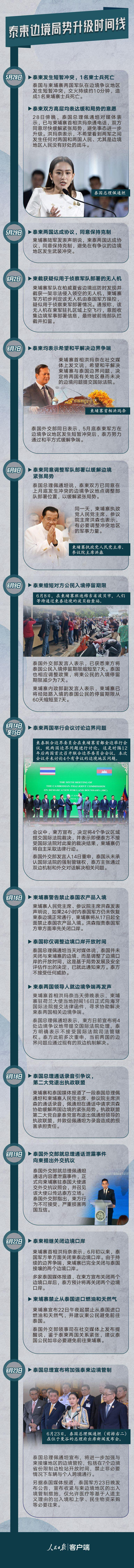 6月7日,此前已出现降温势头的泰柬边境局势再次升级。泰国副总理兼国防部长普坦在与柬埔寨副首相兼国防大臣迪西哈会面后发表声明称,泰柬双方在一些问题上未能达成一致,这令人遗憾。当天,泰方发布多项措施,包括向边境增派军队、关闭检查站、暂停游客往来等。6月9日,泰国和柬埔寨有关方面分别证实,已缩短对方国家公民入境停留期限。