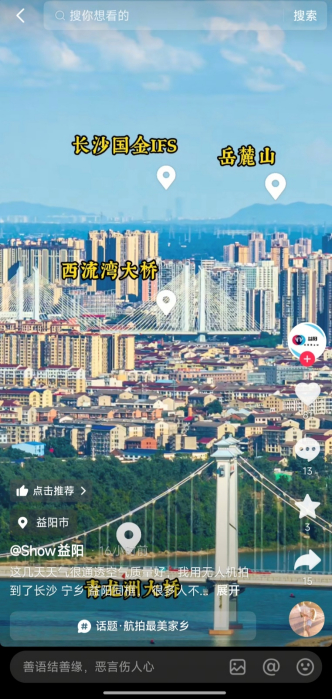 7月2日,摄影博主@Show益阳 在抖音平台发布了一张无人机拍摄的照片。照片中,益阳青龙洲大桥、西流湾大桥等地标与长沙国金IFS、岳麓山同框,引发了网友的热议。