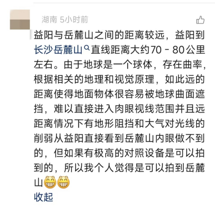 面对质疑,拍摄者@Show益阳 在接受采访时回应:当时拍摄时无人机飞到了120米高空,用摄影软件可以确定,确实是长沙国金IFS和岳麓山,最重要的原因是,这几天天气很通透空气质量好。