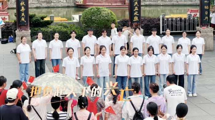 2025年7月,南京夫子庙景区。昂扬的小号声引得路人纷纷驻足,大学生们手拉手,由四面八方汇聚到“天下文枢”牌坊下,唱响《毕业歌》。