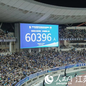 人民网南京7月6日电 (鞠峰)7月5日晚19:30,江苏省城市足球联赛(下称“苏超”)第六轮焦点战——南京队与苏州队的比赛在南京奥体中心火爆拉开。比赛进行到第75分钟,现场电子大屏显示本场观赛人数为60396人,创下“苏超”单场上座新纪录,这也是中国业余足球赛事观赛人数新纪录。