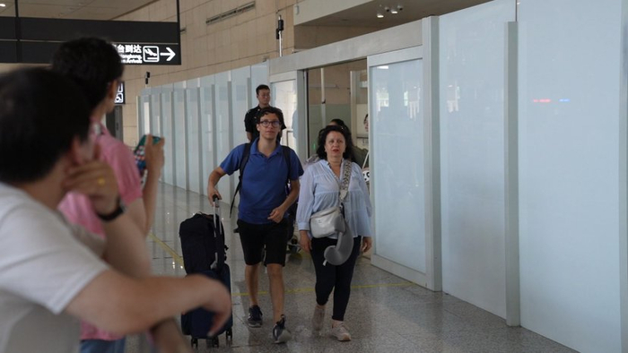 乘坐巴黎—南京直飞航班抵宁的首批法国游客走出机场通道。南京日报/紫金山新闻记者 克良辰 摄
