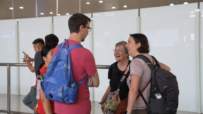 乘坐巴黎—南京直飞航班抵宁的首批法国游客走出机场通道,和来接机的朋友会合。南京日报/紫金山新闻记者 克良辰 摄
