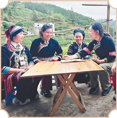 本报记者(右一)采访越南姑娘侬加莲(左二)和猛硐瑶族乡少数民族群众。