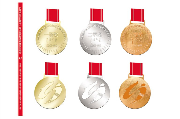 奖牌以本届运动会会徽“奋进”为主基调进行设计,一面刻印会徽“奋进”图案,一面镌刻“内蒙古自治区第十一届少数民族传统体育运动会”“2025・赤峰”和获奖名次,既有本届运动会“logo”形象,又明确运动会届次、举办时间及地点,也寓意践行“更快、更高、更强、更团结”的体育运动精神。