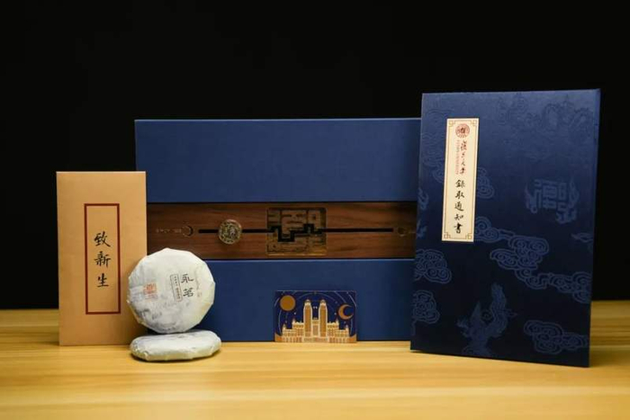 礼盒分为两层。第一层,潞绸为封的录取通知书静卧其中。第二层有两枚茶砖、一张沉金工艺文创NFC卡片、一封书信静候开启。