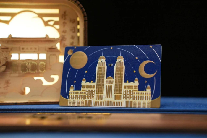 仇崇海介绍,文创设计灵感源自“日月光华,旦复旦兮”。“创作过程中,我构思如何将复旦蓝、光华楼与日月元素自然融合。最终引入星轨,将日月纳入同一画面”。卡片在技术上,以电子产业的基石PCB电路板为载体,加上沉金工艺,带有NFC功能的手机轻触卡片,就能点亮光华楼上的星光,跳转进入《新生入学报到手册》页面。