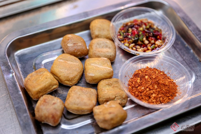 除了紫陶,“非遗”美食也是夜市的主角之一,其中建水豆腐最受游客欢迎。炭火烤架上,一块块方方正正的豆腐被烤得金黄鼓胀,蘸上特制蘸水,外酥里嫩,香气四溢。此外,草芽米线、汽锅鸡等建水特色小吃也吸引了不少食客驻足。