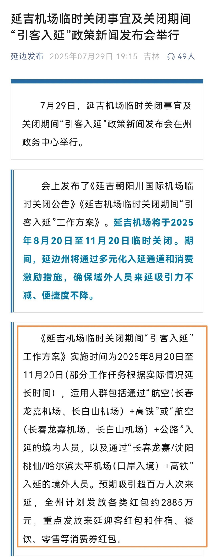 7月29日,延边朝鲜族自治州政府一则公告引发广泛关注:“延吉朝阳川国际机场将于8月20日起闭航三个月。”