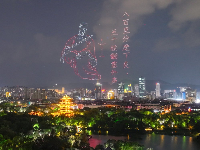2005年7月28日,济南国际泉水节期间,璀璨绚烂的3000架无人飞机秀在大明湖上空点亮泉城夜空。光影交织变换,夜空中倏然出现了“济南二安”李清照、辛弃疾的身影。柔婉清丽的李清照手持团扇,吟咏着“争渡,争渡,惊起一滩鸥鹭”从荷花丛中迎面而来;豪放硬朗的辛弃疾则手持宝剑,高歌着“八百里分麾下炙,五十弦翻塞外声”从历史深处走来。