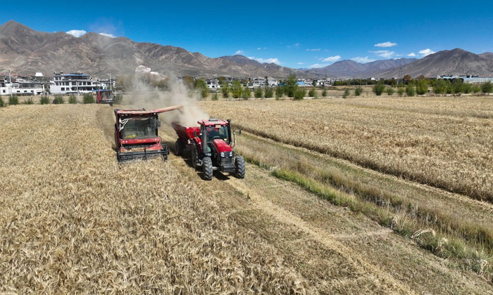 2024年10月16日,日喀则市江孜县班觉伦布村农机服务农民专业合作社社员使用农机收获青稞。青稞是青藏高原地区的特有农作物。近年来,西藏多地立足资源禀赋,加快发展青稞特色产业,延伸青稞产业链,从传统粗加工向精深加工转型。江孜县研发生产的青稞系列产品达40余种,青稞糌粑粉、青稞啤酒等在青藏高原大有名气,青稞饼干、青稞饮料等销往上海、江苏等地。2024年,江孜县青稞产业产值达1.48亿元,较上年增长66%。