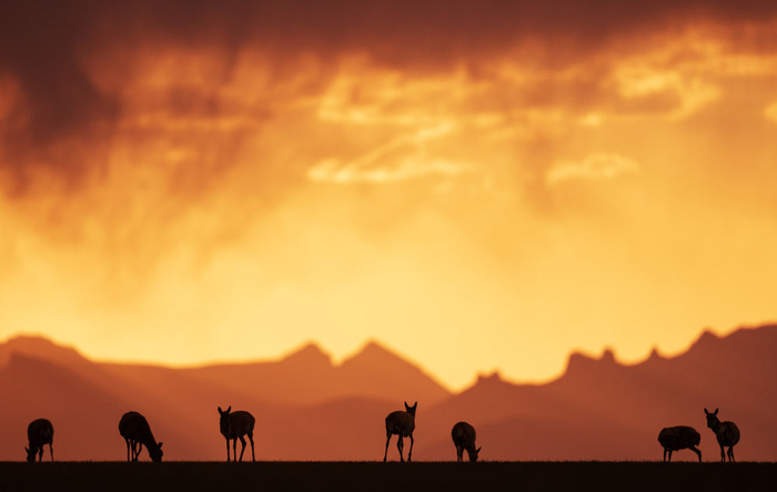 2024年6月16日,在羌塘国家级自然保护区境内的那曲市申扎县买巴乡鲁确塘草原上,待产的藏羚羊沐浴在晚霞中。藏羚羊是国家一级保护动物,经过多年有效保护,种群数量明显增长,保护等级从过去的“濒危物种”降为“近危物种”。《2023西藏自治区生态环境状况公报》显示,西藏境内藏羚羊种群已增长至30多万只。