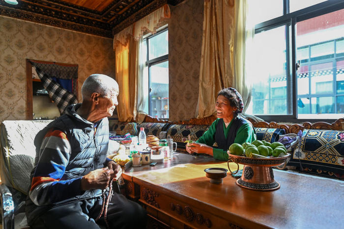 2025年7月21日,58岁的林芝市朗县拉丁雪村妇联主席格桑德青(右)在自家改造提升后的餐厅里为88岁的父亲乔多吉削水果。近年来,西藏边境县朗县坚持“群众自愿、因地制宜、循序渐进”原则,推进农村房屋改造提升建设。拉丁雪村采取“政府主导、群众参与、适当补贴、统规自建”模式,对有意愿的群众实施住房改造提升。针对村民住房多为石木结构,抗震等级低、采光差等问题,当地聘请专业设计团队,最大限度满足群众房屋功能布局需求。截至2025年7月底,拉丁雪村已有42户178人入住新房。
