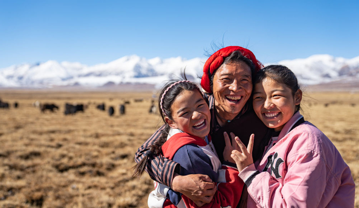 2023年11月15日,拉萨市当雄县中学生斯曲卓玛(右)和爸爸、妹妹在一起。斯曲卓玛和班里其他51名同学均来自草原,目前在学校接受现代化的双语教育。在国家支持和组团式教育援藏帮助下,西藏逐步建立起涵盖学前教育、基础教育、职业教育、高等教育、继续教育、特殊教育的现代教育体系,落实农牧民子女“上学无负担”措施,教育质量稳步提高。