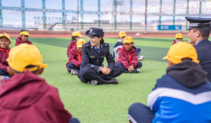 2025年6月23日,巴桑普赤在巴嘎镇小学和学生们互动。阿里地区普兰县巴嘎镇塔尔钦国际旅游小镇面朝纳木那尼峰,背靠冈仁波齐,是游客们转山徒步的重要门户,每年都要接待成千上万的游客。2023年,巴桑普赤主动来到塔尔钦边境派出所,成为这里的第一位女民警,而在从警前,她是一名小学数学教师。在这里,游客高反昏迷、孩子转山走失、背包客遗失手机之类的警情层出不穷,塔尔钦边境派出所民警需要时刻待命,处理各种突发状态。目前,“警察阿佳”(“阿佳”在藏语里是姐姐的意思)的队伍还在壮大,今年派出所还会迎来新一批女民警与巴桑普赤并肩守护高原。