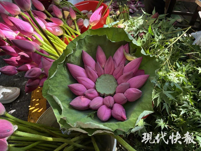 江南可采莲,莲叶何田田。“寻荷打卡”成了苏州夏日文旅消费的新名片。荷花为主,莲蓬、菱角、金铃子、桃子、李子、白兰花、茉莉花等点缀其间,以时令风物拼凑出活色生香的苏州夏天。有导游摇着小旗带队前来,荷花市集已经成为苏州旅游必打卡的一景。还有摄影师带着单反相机现场营业,为爱美的买花人就地拍写真。
