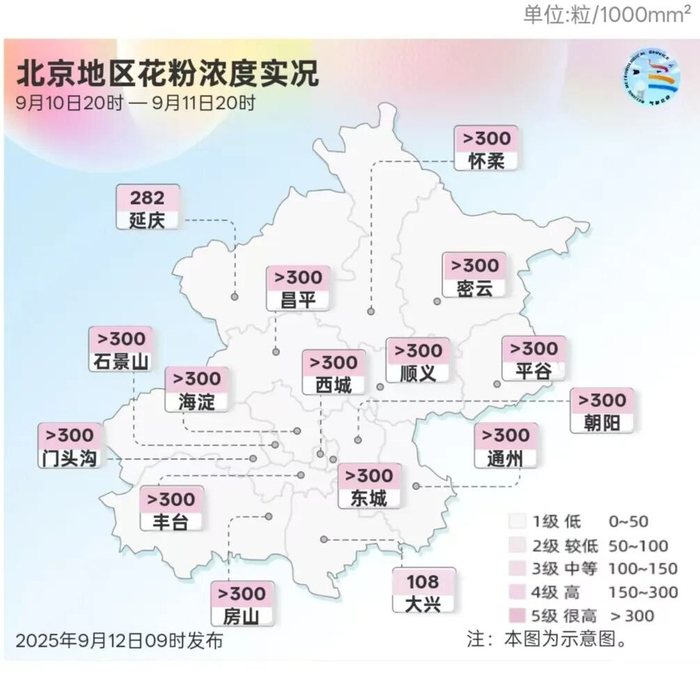 根据近三天北京地区花粉浓度监测预报分析,预计今天(9月12日)白天北京地区花粉过敏风险等级4—5级,为高到很高风险,预计有75%以上的患者出现症状,敏感人群注意防护,减少外出,规范用药。