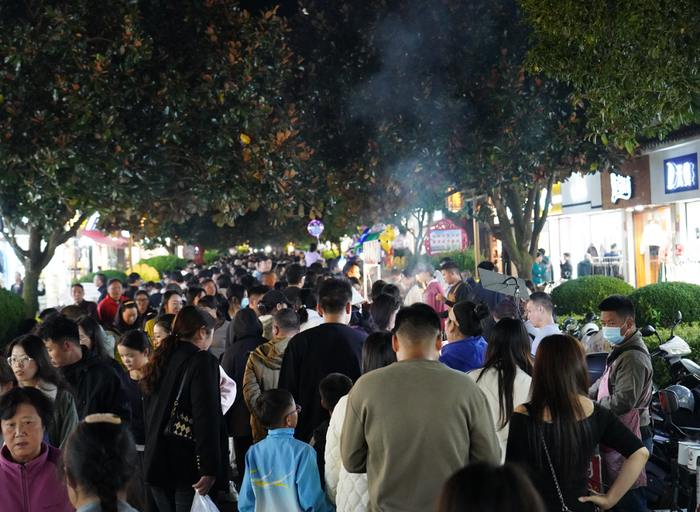 晚上八点,腾冲市腾越街道一街步行街逐渐热闹起来。小吃摊飘起袅袅炊烟,手工艺品摊位前围满了人,孩子的笑声和商家的吆喝声交织在一起,映照着这条老街重新焕发的活力。