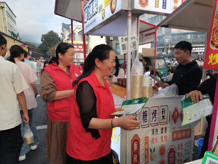 除了治安巡逻,更让居民们感到新鲜的是“会走路的服务台”。社区将文明实践活动直接“搬”到了夜市——义警和志愿者边走边发放手册、讲解法律常识,从食品安全到反诈知识,内容实用又接地气。