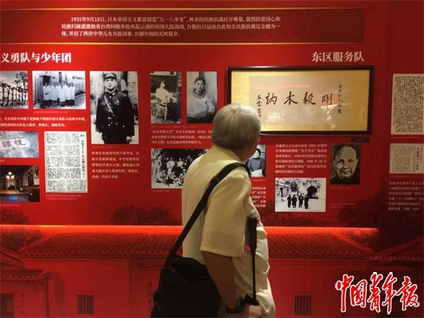 近日,萧开平来到上海,在纪念台湾光复八十周年主题展览中注视着父亲曾加入的东区服务队介绍,在《阿公的战场》纪录片中讲述着珍藏在心底的历史故事。中青报·中青网记者 唐轶/摄