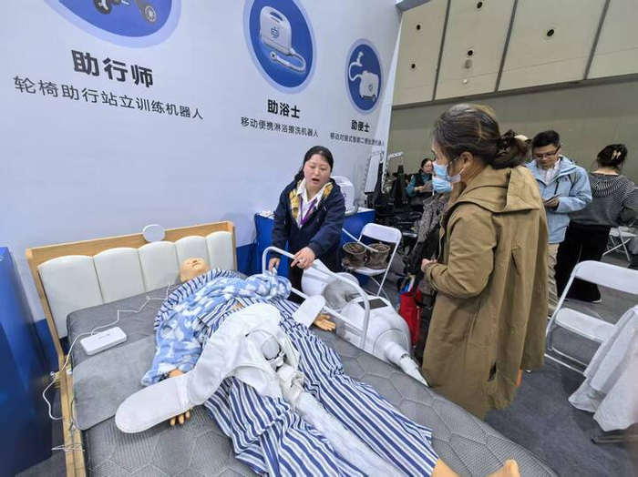 “它叫‘助便士’,负责为卧床老人处理大小便;它叫‘助浴士’,是移动淋浴擦洗机器人;它叫‘助行师’,是辅助站立和行走训练的机器人……”在江苏小艾机器人公司的展位前,总经理林云正热情地向观众介绍不同赛道的护理机器人。围观的观众不断抛出问题:“贵不贵”“返修率高吗”“操作复杂吗”“能租吗”……
