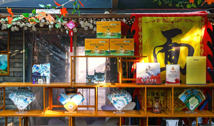 11月20日,烟台所城里历史文化街区“巫山人家”烤鱼店内,摆放着不少巫山的产品。