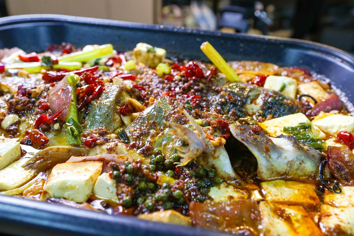 11月20日,山东省烟台市莱山区“渝三娃巫山烤鱼旗舰店”,麻辣鲜香的烤鱼展现着独特的巫山特色。
