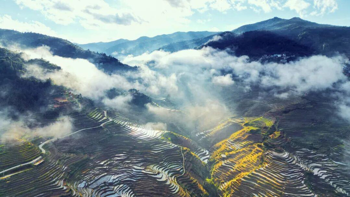 撒玛坝万亩梯田堪称视觉盛宴,1.6万余亩田垄从海拔600米铺展至1800米,4300多级梯田在12月初至次年1月中旬迎来冬樱绽放,粉白嫣红的花簇与丰水期的银镜田面相映成趣,清晨云雾翻涌、午后花香萦绕,“四素同构”的生态农耕系统尽显人与自然的和谐之美。