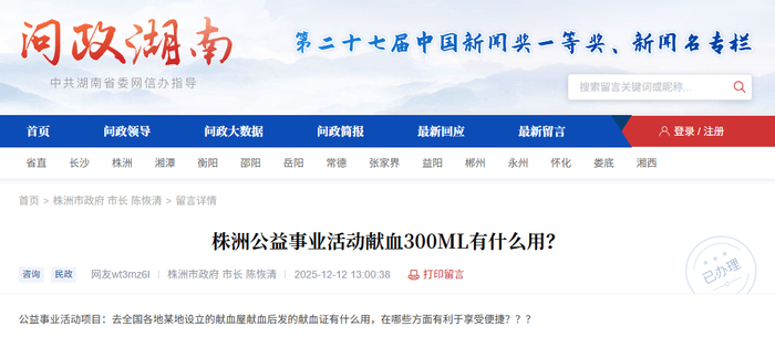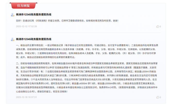 近日,有网友在红网《问政湖南》栏目留言,咨询获得无偿献血证后的主要作用,尤其关注其在全国范围内的实用性与便捷性。对此,株洲市12345政务服务便民热线作出了详细回应,清晰阐述了献血证的普遍功能与本地特色激励政策。
