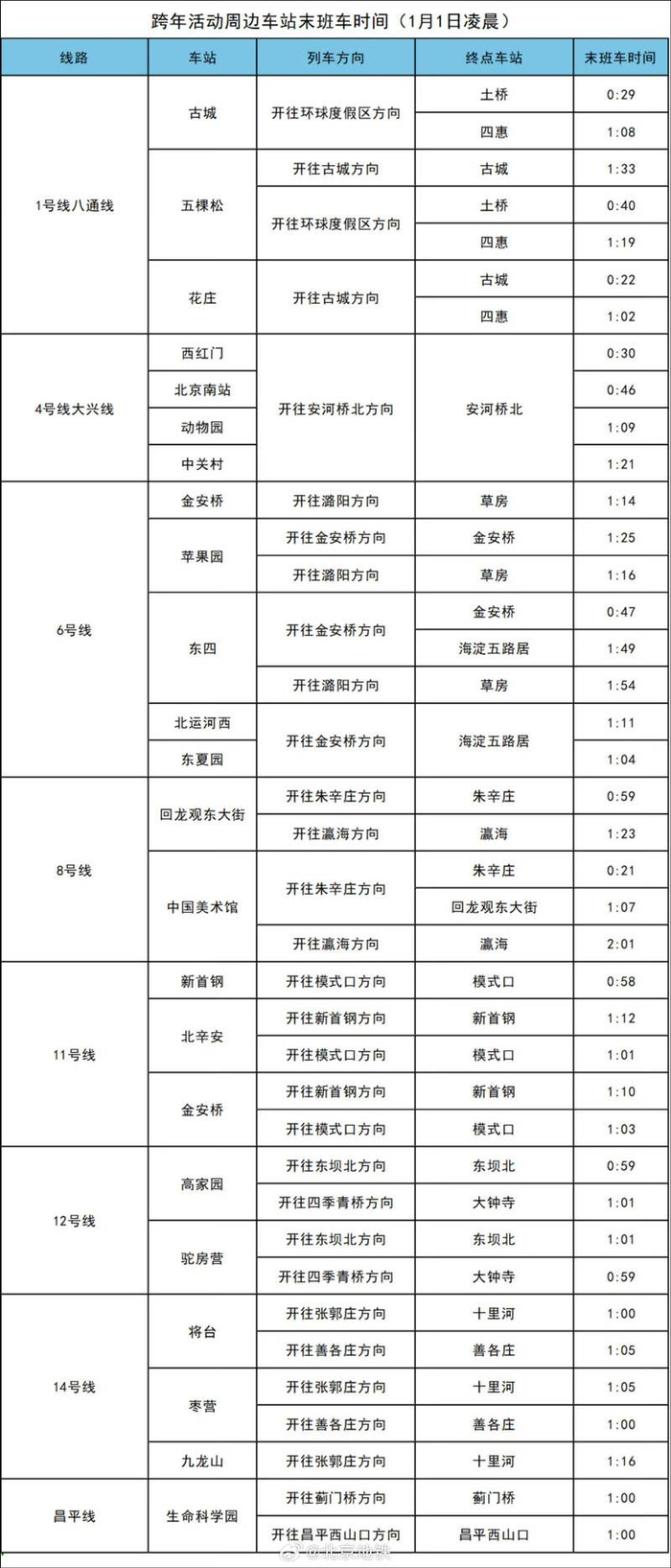 新京报讯(记者裴剑飞)记者从北京地铁方面获悉,为保障跨年活动安全顺利进行,2025年12月31日,地铁1号线八通线、4号线大兴线、6号线、8号线、11号线、12号线、14号线、昌平线部分区段延时运营,具体运营信息如下,建议市民合理安排出行路线。