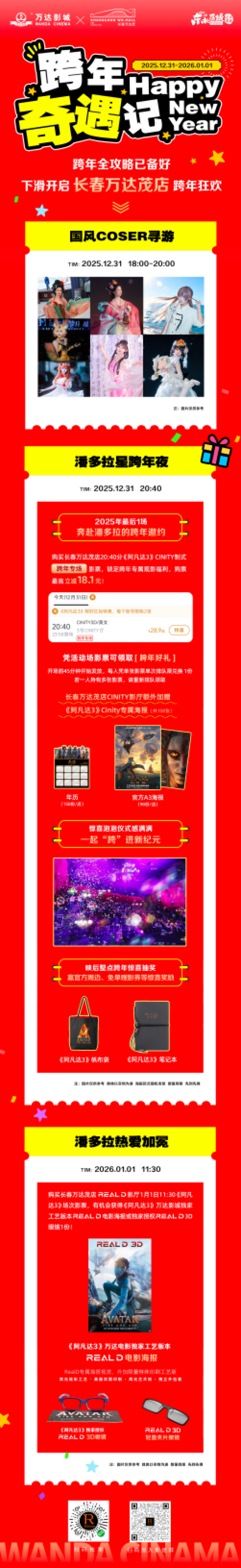 特色活动:多地指定门店观看《阿凡达3》《疯狂动物城2》《寻秦记》等影片,可享购票立减优惠;12月31日零点场设置喷泡泡、惊喜台词互动、“新年快乐”字卡合影等跨年环节;长春万达茂店特邀国风coser巡游,现场赠送周边礼品与优惠券,国风爱好者不容错过。