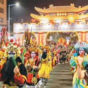 伴着璀璨灯光和欢快鼓乐,本次活动的“重头戏”民俗文体汇演大巡游在汕尾市区进行。沿途,精彩的民俗文体表演轮番登场——龙舟造型的花车色彩绚烂,汉服表演尽显中华礼仪之美,二十四节令鼓敲出季节的韵律与民族的豪情;来自金门的昊天将首表演队、台湾关庙队与汕尾本地队伍并肩而行,共同演绎“两岸一家亲”的动人乐章;两岸青年醒狮队的同台献艺,腾挪闪转之间默契十足、形神相合,赢得沿途观众频频喝彩。