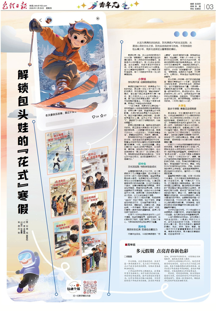 从活力满满的运动挑战,到充满烟火气的生活实践;从浸润心灵的文化之旅,到充实自我的学习充电,不同学段的包头青少年,用多元选择定义着寒假的精彩。挑战、探索、陪伴、奉献,每一种打开方式都藏着青春的滚烫与明亮。寒假未完待续,更多精彩的青春故事,还在继续书写……