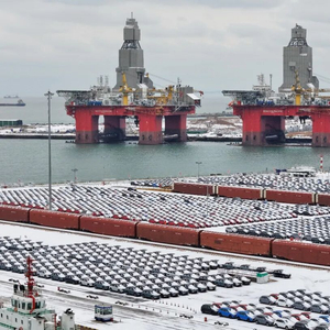 2026年1月18日,在山东港口烟台港拍摄的出口汽车和半潜式钻井平台。(唐克/人民视觉)