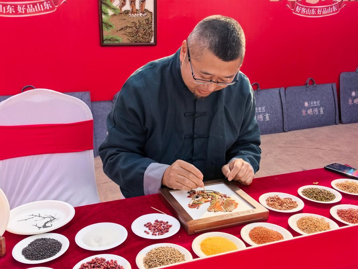 “东明粮画也叫‘福籽绘’,是黄河岸边土生土长的民间手艺。”韩国瑞介绍,粮画以书法、花鸟、吉祥图案为主要题材,选用天然杂粮,不染色、不加工,靠颗粒形态与色彩层次构图,造型生动、寓意吉祥,被称作“挂在墙上的精神食粮”。过去多是农家自娱自乐,如今走进大集、校园、文创市场,成了传播黄河文化、传递新春祝福的特色载体。“大集是非常好的传承舞台,老百姓喜欢、孩子愿意学,老手艺才能代代传下去。”韩国瑞说。