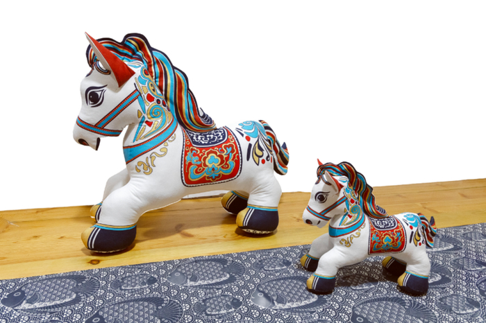 胶东版画烟台市级非遗代表性传承人朱武学以胶东版画为源,创作出“五花马”生肖布艺产品,通过丝网制版、油墨刮印等传统工序,将唐代宝相花、卷草纹、缠枝莲等经典纹样精准复刻在布艺之上。