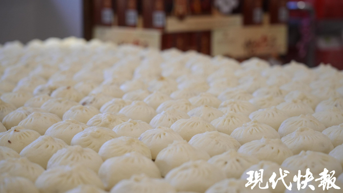 “最近恰逢‘年蒸’,我们早上5点半就到岗了,老店和新店四五十个白案员工一天要做5万多只包子,是平时工作量的3倍。”今年48岁的徐小梅是怡园饭店四望亭店白案组长,她告诉现代快报记者,每年春节前二十多天,是他们最忙碌的“年蒸季”。