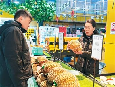 走进馆内,记者看到场馆负责人毛勇习正在热情地向顾客介绍刚开出的榴莲。“这是刚到的泰国金枕榴莲,个头更大、果肉更多,从形状也能看出来,比其他榴莲要更加饱满!”