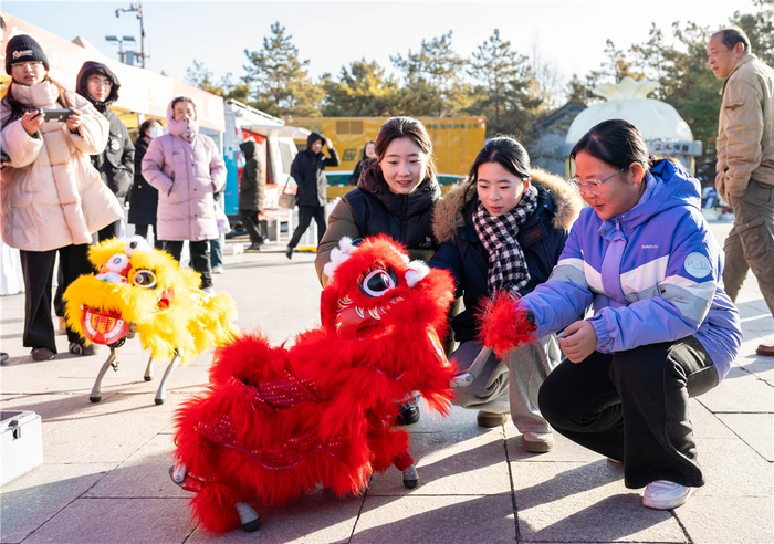 市民与表演舞狮的机器狗互动。