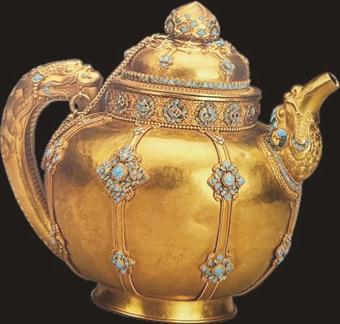 西藏博物馆馆藏文物嵌宝石金茶壶。