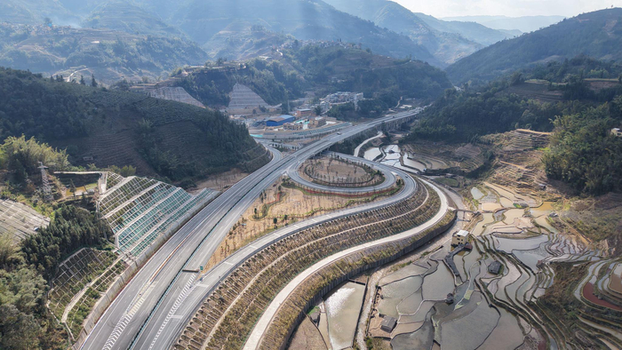 该高速串联元阳南沙镇与绿春大兴镇,桥隧比高达86.26%。通车后,元阳到绿春的通行时间将从目前的2小时直接缩短至40分钟以内,惠及沿线11个乡镇,超10万人口,将成为撬动山区资源开发、旅游发展的重要支点,全面助力边疆民族地区乡村振兴和经济发展。
