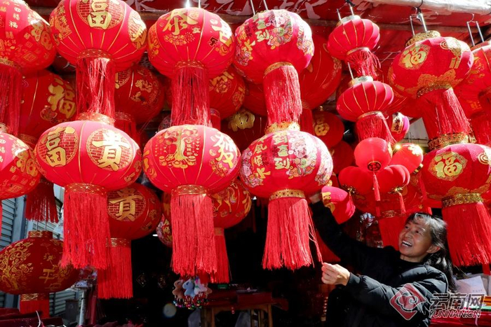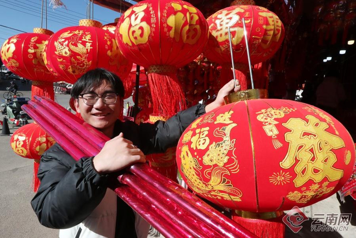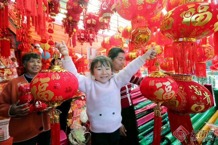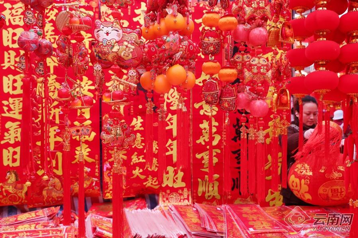 晋宁区昆阳街道年货市场节庆饰品热销,以春联、福字、灯笼为代表的“红火系”饰品备受市民青睐。