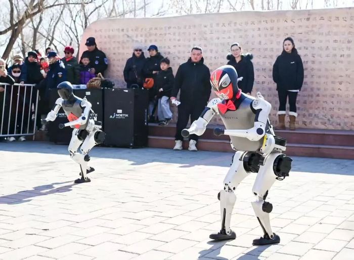 在春晚小品《奶奶的最爱》中,松延动力的E1、N2、Bumi及仿生人形机器人凭借侧手翻、空翻、趣味互动等绝技圈粉无数。此次庙会现场,松延动力机器人团队带来特色演出,机器人队列动作整齐划一、刚劲有力,一招一式气势十足,让传统民俗文化与前沿科技碰撞出亮眼火花。