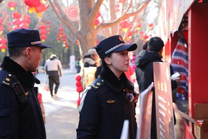 距离东城区城管执法局指挥中心8公里的地坛庙会南门外,城管队员吴姚正在巡查。这位来自湖南的姑娘,是东城区和平里街道综合行政执法队的一名新兵。2026年春节,是她第一次年初一在岗承担春节保障工作。